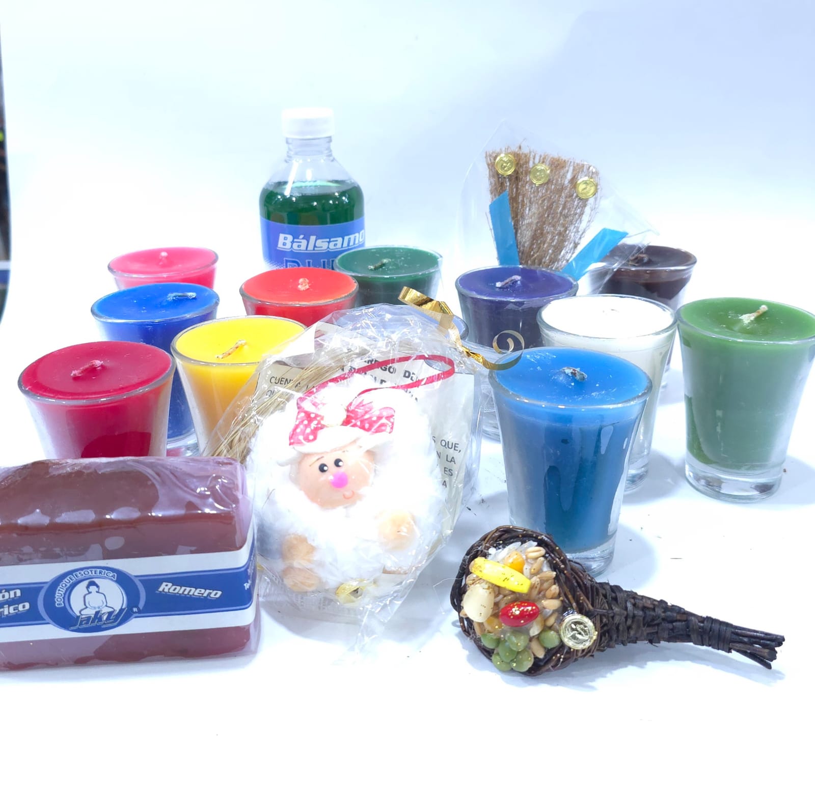 12 VELADORAS CON VASO, BORREGO DE LA ABUNDANCIA, ESCOBA RAÍZ DE CANELA. CUERNO DE ABUNDANCIA CH., JABON AURICO Y 1 BALSAMO DE LIMPIA