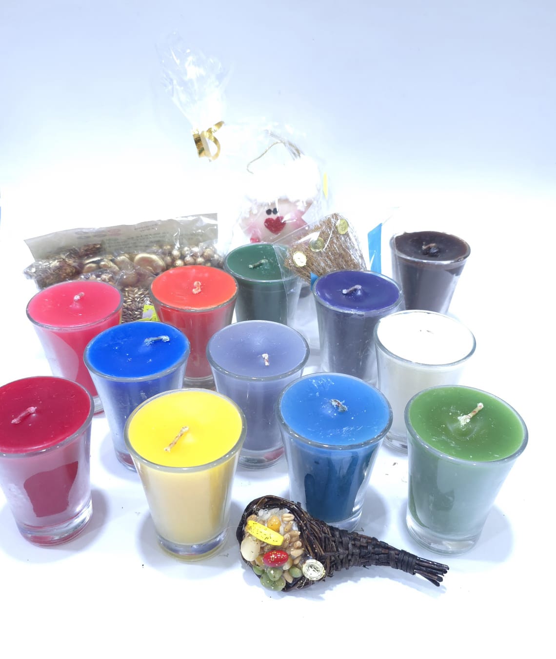 12 VELADORAS CON VASO, CUERNO DE ABUNDANCIA, BORREGO DE LA ABUNDANCIA, SEMILLAS DE ABUNDANCIA