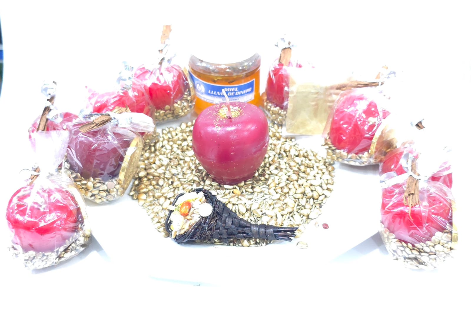 12 VELADORAS MANZANA, SEMILLAS DE LA ABUNDANCIA, CANELA, 12 MONEDAS, 1 MIEL DE DINERO, UN POLVO DE ORO Y CUERNO ABUNDANCIA
